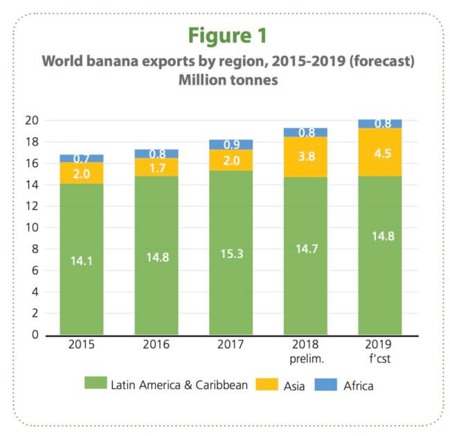 As the graphic below from the FAO’s Banana Market Review 2019 clearly shows, Asia is very much a region to watch, as export volumes increase and as China secures its very considerable national consumption from a growing diversity of sources, including Latin America. China’s own problems with domestic production relating to TR4 and climate change are clearly a critical factor, as will be the fast-growing national retail chains and their sourcing strategies.